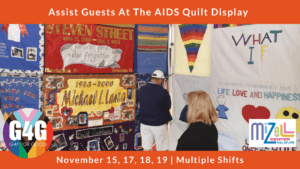 We are partnering with the Mizell Center as they host an AIDS Memorial Quilt exhibit and discussion. There are six shifts available on four separate days—choose the one that best fits your schedule! Volunteers will setting up and helping out during a panel discussion on November 15, or providing assistance in the quilt display area November 17-19.