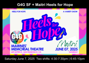 Gay For Good volunteers will be supporting Maitri Compassionate Care with their annual variety show fundraiser – Heels for Hope. We will be helping with event reception, registration, auction check-in & check-out and break down. All volunteers are invited to stay for the variety show which starts 7pm.
